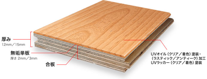 その上に薄い天然木や化粧材を貼り、